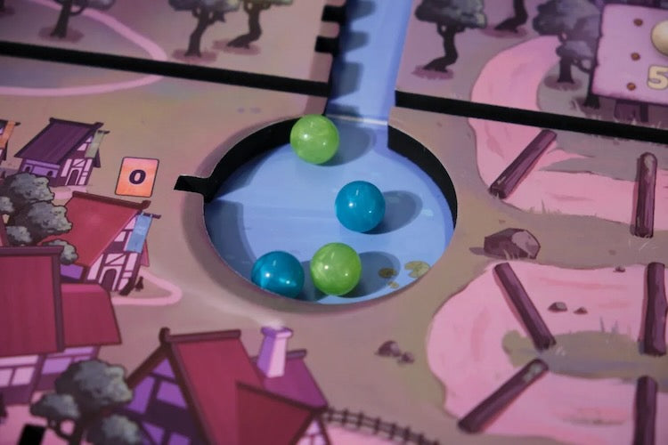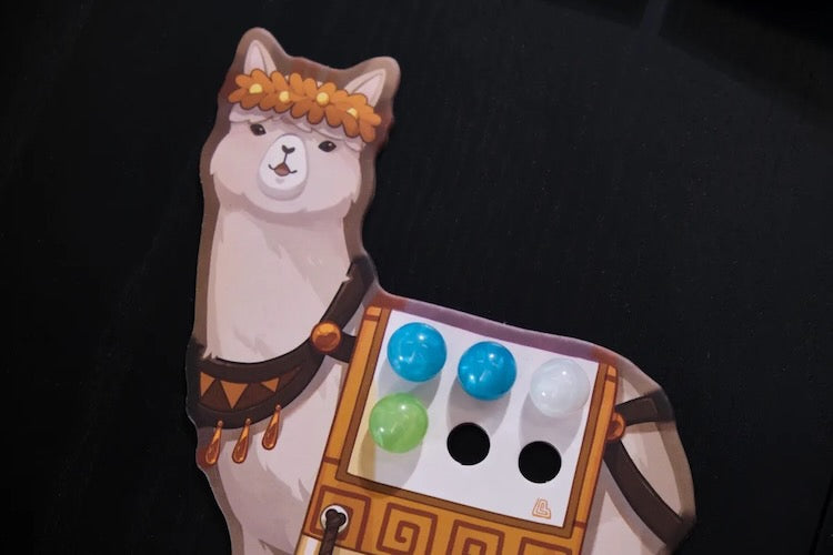 Once all tribe tokens are placed, release the magic pearls to roll down the rivers. Then collect a pearl at each tribe token you placed, and store it on your Alpaca for now. Remaining pearls roll downstream to be blocked and picked at other tribe tokens, or end in the lake.