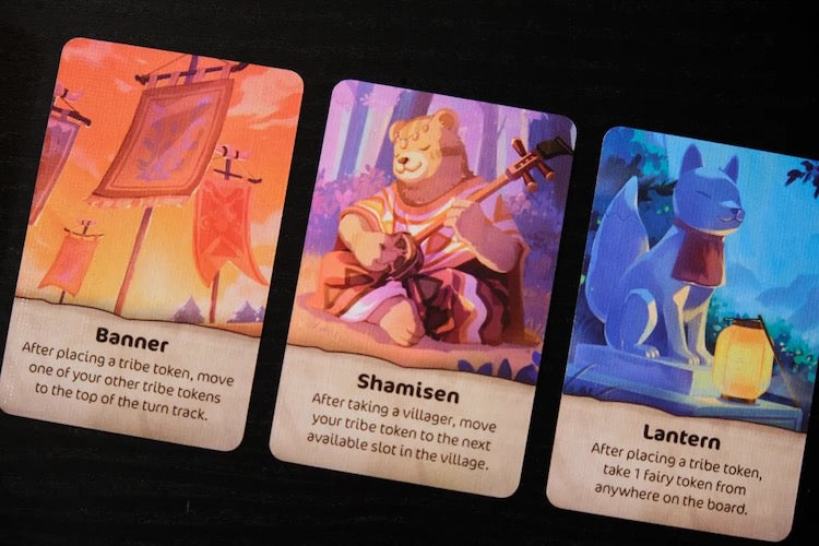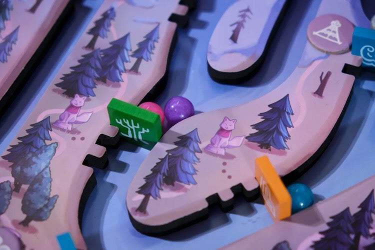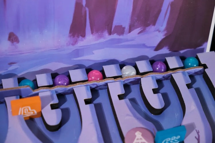 In each of 5 rounds of play, take turns paying camp cards (resources) to place your 3 tribe tokens into various slots along the rivers, to get the magic pearls you need. Pay more camp card resources to place higher up the rivers to pick pearls earlier. However, with clever placement and use of camp card powers, you can still get valuable pearls efficiently downstream. Use your Tribe tokens to block then collect magic pearls that flow down the 12 rivers. Collect pearls needed by villagers to ensure prosperity for the village at the bottom of the 12 Rivers.