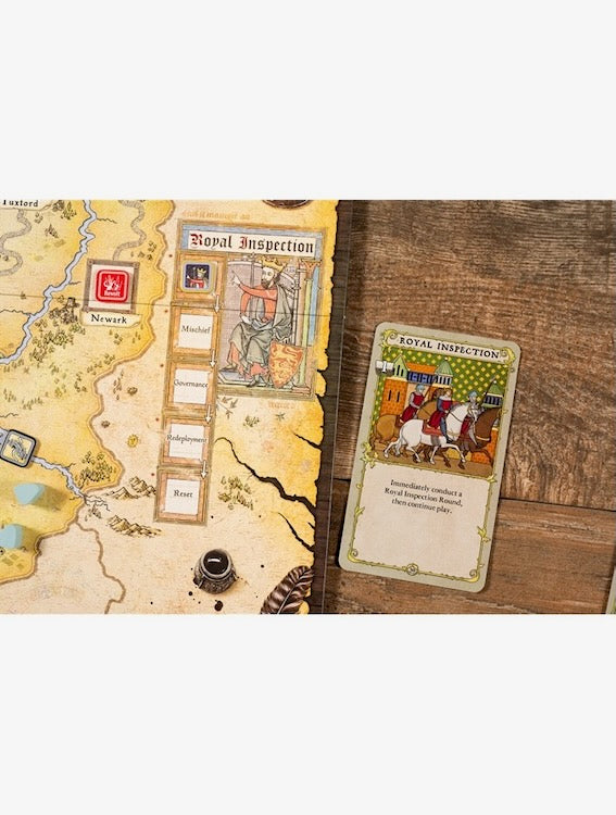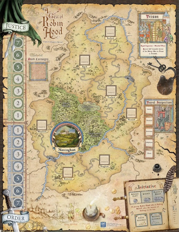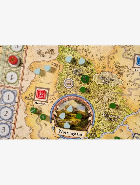 - A second new hidden movement mechanic: Carriages serve as a simple twist on Lines of Communication, transferring wealth back to Nottingham while providing a target for robbery by the Merry Men—but some of them might be a trap, containing concealed Henchmen!