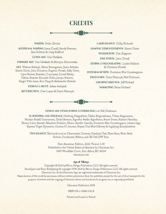 Age of Vikings is a standalone game built with Chaosium’s Basic Roleplaying: Universal Game Engine. This rulebook contains the Hero creation rules, including Passions, family history, and ever-important Icelandic nicknames. The book also has rules for the Basic Roleplaying system as used in Age of Vikings, including skills, conflict resolution, and hero development