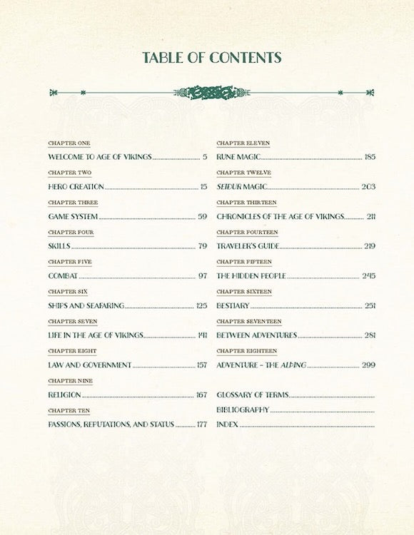 Age of Vikings covers the history of mythic Iceland in minute detail. The book outlines the life of a Viking, laws and government, religion, and the wild and wondrous creatures of legend. Take to the frigid seas with extensive rules for ships and seafaring, including naval combat—No other roleplaying game so effortlessly thrusts you into one of the most fabled cultures and time periods in history!