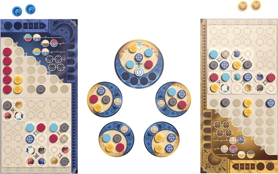 Decorate the magnificent ceilings of the palace. Will the vaults look more beautiful by day or by night? Azul Duel invites you to play with light and pit opposites against each other.This competitive strategic game for two players retains the purity and elegance of the original Azul while adding an extra tactical dimension in which you determine the pattern in which tiles will be placed, in addition to drafting tiles to complete that pattern.