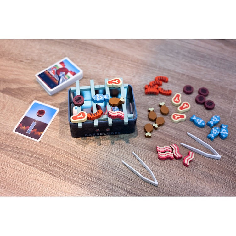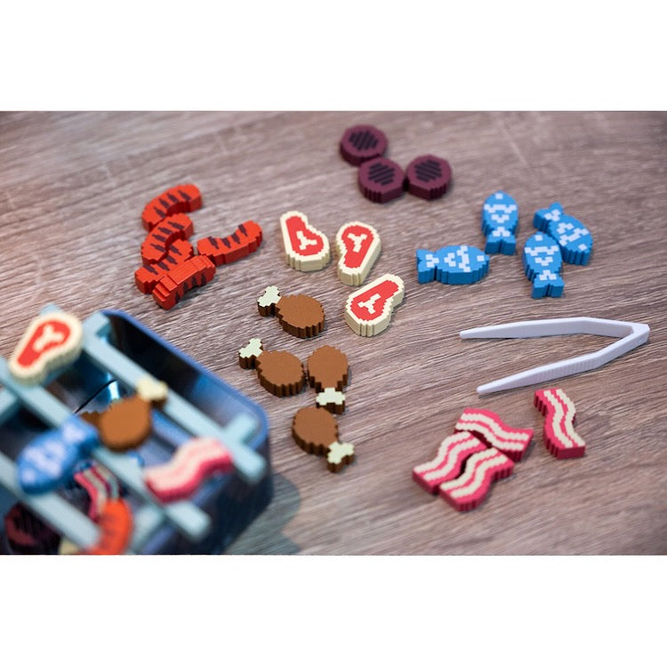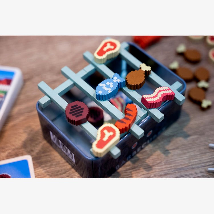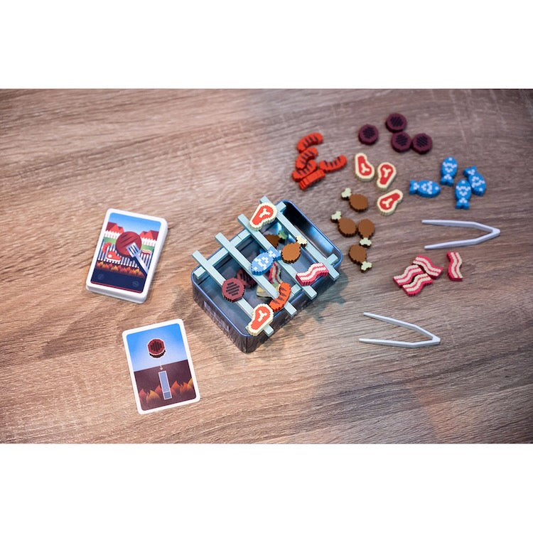 Take turns to add food add to the grill If any piece fall off, take a card. Get 2 cards and you're eliminated. The last player standing, wins.