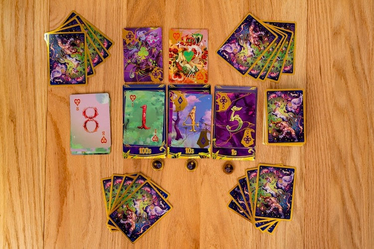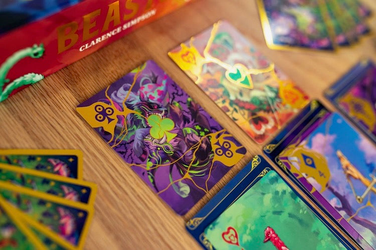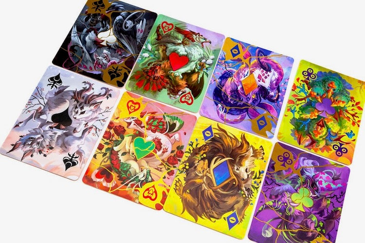 But things get wild when the beasts arrive. These mischievous creatures correspond to specific card types — like Whole Hearts or Broken Spades — and once they show up, they restrict where those card types can be played on the board. Beasts are startled when placed above matching cards, which makes them move (or even flee), and part of your team's challenge is luring and managing these creatures so that they don't block your most valuable options.