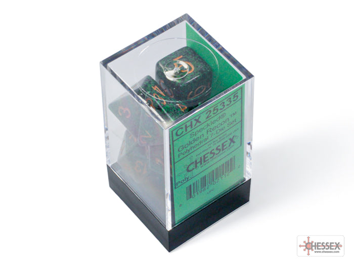 This set contains 7 Speckled Golden Recon dice with gold numbers