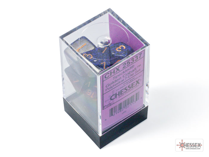This set contains 7 Speckled Golden Cobalt dice with gold numbers
