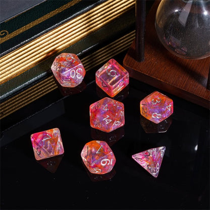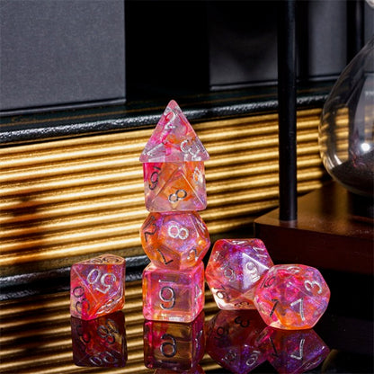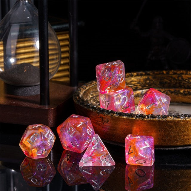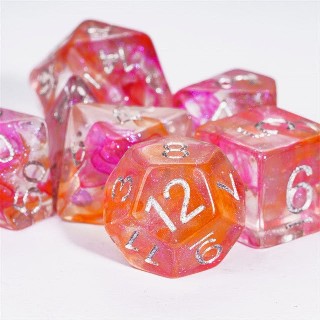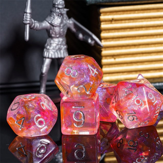 Explode onto the scene with this brilliant fusion of fiery pinks, radiant oranges, and sparkling stardust. These dice evoke the heart of a stellar event: bold, bright, and brimming with energy. Swirls of nebula-inspired colour shimmer through crystal-clear resin, with silver inked numbers.