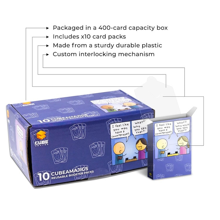 Cubeamajigs are reusable gaming packs that allow you to recreate the experience of opening a sealed pack of cards! They also serve as a great way to store a sideboard or cards together.