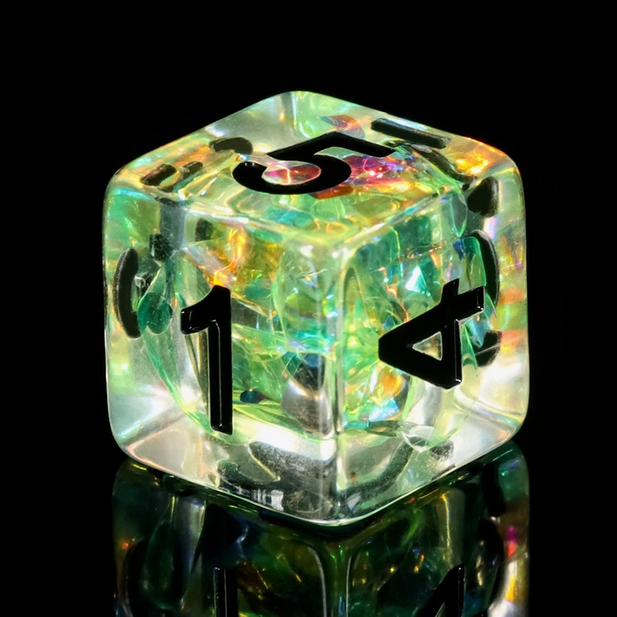 This stunning polyhedral set features green iridescent mylar flakes embedded in the resin making helping evoke the feeling of sun shining through the leaves covering a dense grove.