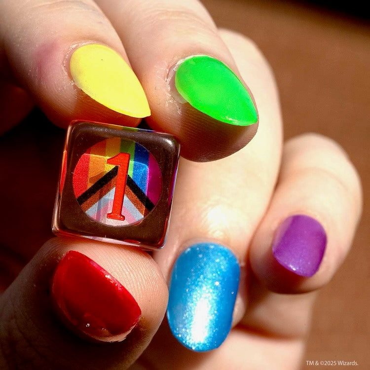 The D&D Pride Dice Set is a vibrant and meaningful addition to any tabletop gaming collection. Featuring a clear design with rainbow-colored ink, each number is uniquely color-matched to represent the spectrum of Pride. Every die in the set includes an embedded mini Progress Pride Flag, a symbol of diversity, unity, and representation.