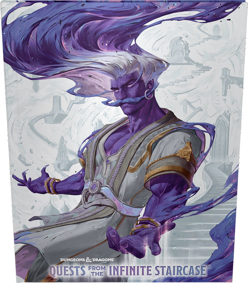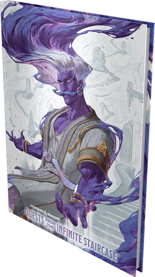 Quests from the Infinite Staircase embraces the magic of the most beloved Dungeons & Dragons adventures of all time. Your journey begins in the Infinite Staircase, a dreamlike expanse with doors leading to fantastical worlds, where you’ll meet Nafas, a noble genie who fulfills wishes with the help of valiant heroes—like you! As you explore what lies beyond each door, embark on timeless adventures and make memorable moments with your party. This handpicked collection contains 6 remastered first edition adventures, complete with striking settings and a lovable cast of characters. These unforgettable quests can be run individually or as a delightful campaign that takes characters from level 1 to 13.
