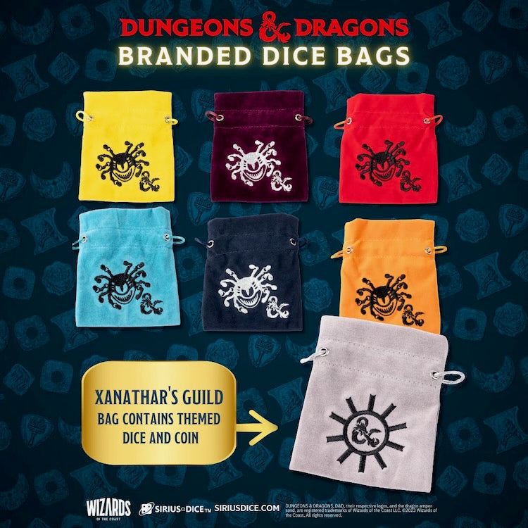Dive deep into the world of the Dungeons & Dragons Xanathar's Treasure Packs: Gold Edition, where every pack is a gateway to a D&D adventure. Each pack contains a full 7-piece dice set, a metal currancy/themed coin, and a quality embroidered D&D bag. Be on the hunt for only 50 24K GOLD PLATED XANATHAR COINS!
