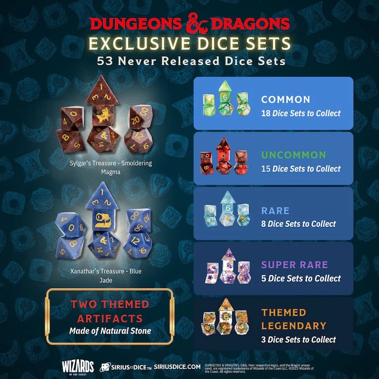 Explore 53 never Released Dice Sets, including specialty themed sets! There are 3 sets of Themed Legendary Dice and 2 Themed Artifact Dice Sets made out of Natural Stone. Themed Legendary Dice Sets includes Xanathar trapped within each die. Dice set rarities range from Common, Uncommon, Rare, Super Rare, Themed Legendary, and Themed Artifacts.