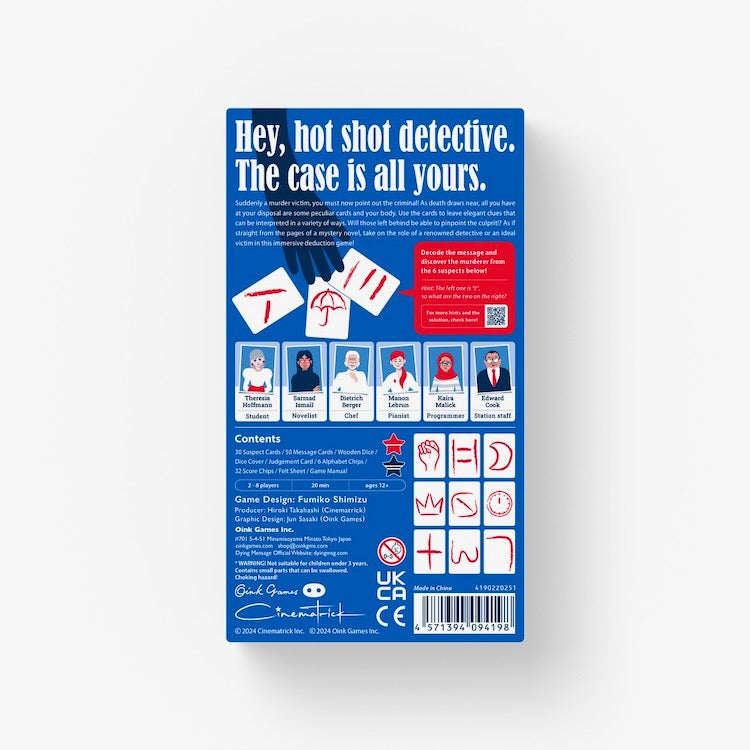 Suddenly a murder victim, you must now point out the criminal! As death draws near, all you have at your disposal are some peculiar cards and your body. Use the cards to leave elegant clues that can be interpreted in a variety of ways. Will those left behind be able to pinpoint the culprit!? As if straight from the pages of a mystery novel, take on the role of a renowned detective or an ideal victim in this immersive deduction game!