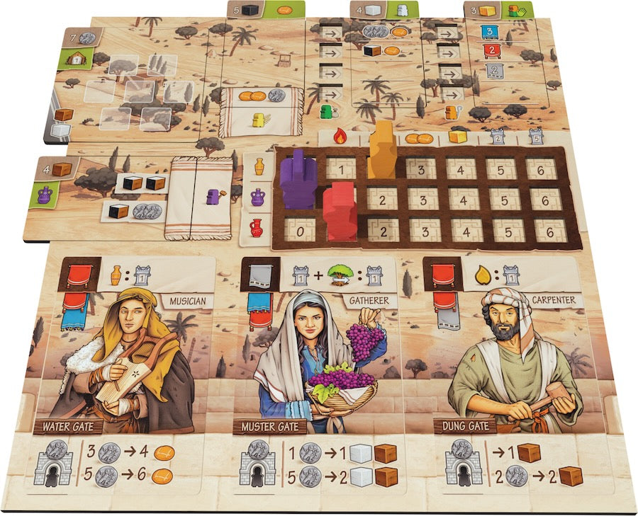 Ezra and Nehemiah is a thematic strategy game for 1-4 players, set in ancient Jerusalem. Players will be building the temple and city walls, and teaching the Torah to returning exiles. Players may also seek to develop their land, travel to settlements outside the city walls, or stoke the altar's fire to keep it burning day and night. The prophets, Haggai and Zechariah will be doing their part to keep the people focused on what is most important.