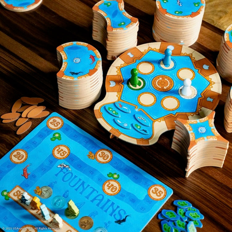 Fountains is a take-and-make game in which each player starts with a round fountain that features a spout and room for four features.