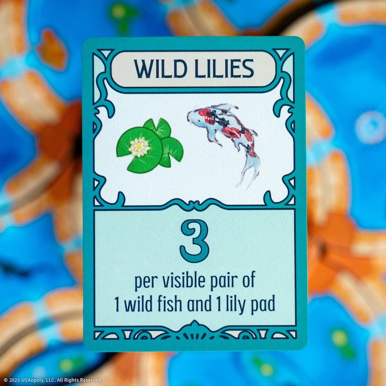 When someone lands on the green, blue, or white space with the matching colored token, everyone scores for the linked item: lilypads, separate pools linked by constant water flow, and fish. (Fish come in three types, and the player who scores fish chooses which color scores.) For each item, you score 1, 2, 3, etc. points if the item is on the first, second, third, etc. level.
