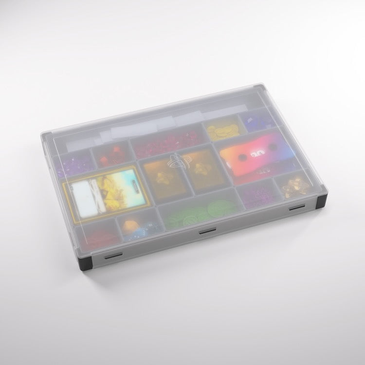 The Token Silo XL stores and organizes a vast variety of tokens, tools, cards, dice, and many other items. There are 15 trays in 5 different sizes, including 2 Mini-American trays, 2 Standard Card trays, as well as 1 extra-long tray. All trays are fully removable and can be swapped with trays from the original Gamegenic Token Silo and Token Silo Cards Add-on, granting maximum flexibility and additional customization. The cover of the Token Silo XL clips to the bottom for easy access and more space on the gaming table.