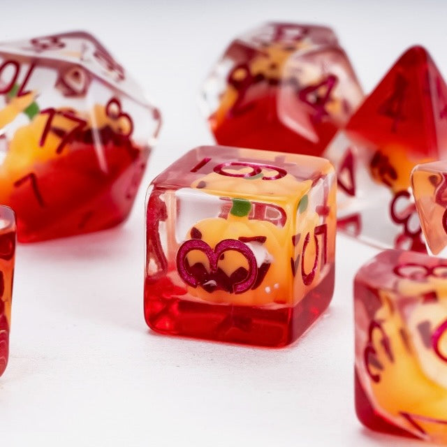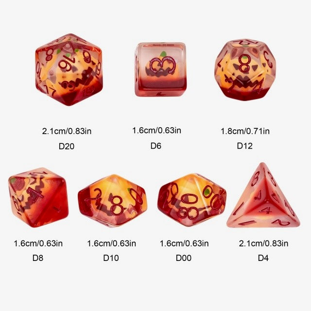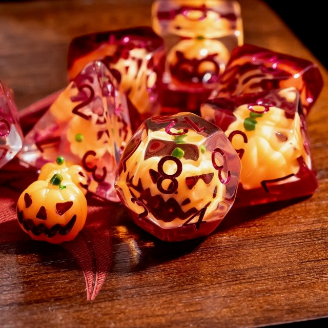Bring spooky charm to your tabletop with the Haunted Harvest Dice Set. Each die features a grinning jack-o'-lantern core and numbered in wickedly gleaming crimson. Perfect for Halloween one-shots, horror campaigns, or just showing off your gourdgeous dice taste year-round.