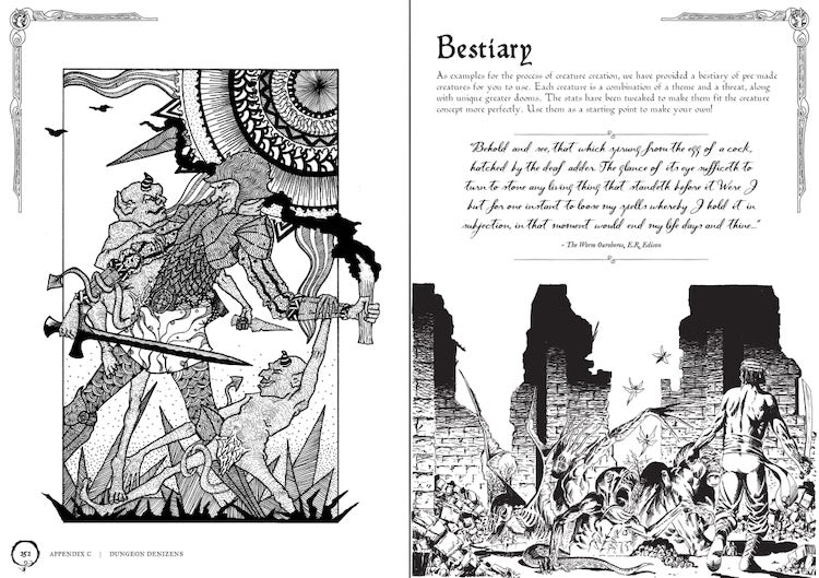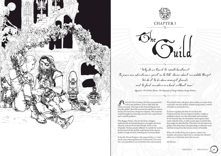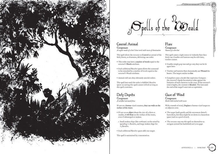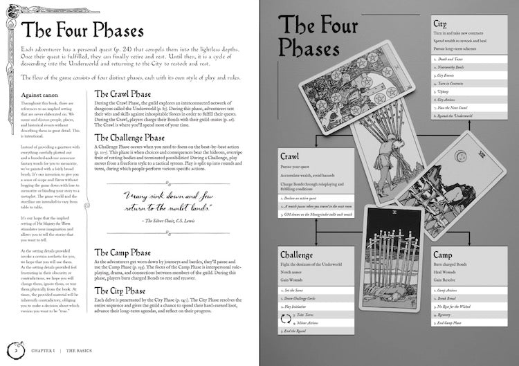 The game is intended for a traditional setup between a single GM and 3-6 players. It emphasizes long-term, Metroidvania-like play. The book is 404 pages long, split up over 10 chapters and 5 appendices. The print edition is silver foil stamped and has a ribbon bookmark. The digital edition is thoroughly cross-linked, with a robust index. It is a complete game with everything you need in one tome (just add a tarot deck).