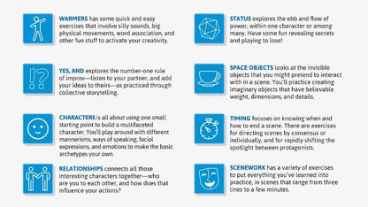 Based on hundreds of hours of professional workshops, Improv for Gamers provides fun and easy exercises designed to take your tabletop or live-action gaming group to the next level. Play one or two before your next session to get players warmed up and engaged, or take a deep dive into developing a particular skill! No improv experience required.