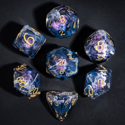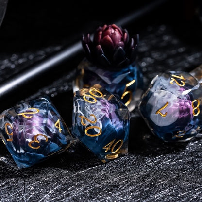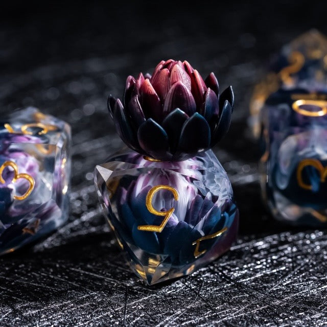 Unfold mystery and elegance with the Midnight Bloom: Lotus Dice Set. Each die cradles a delicate black lotus in full bloom, swirling with smoky hues of indigo and grey. Golden numerals shimmer across each diamond cut face.