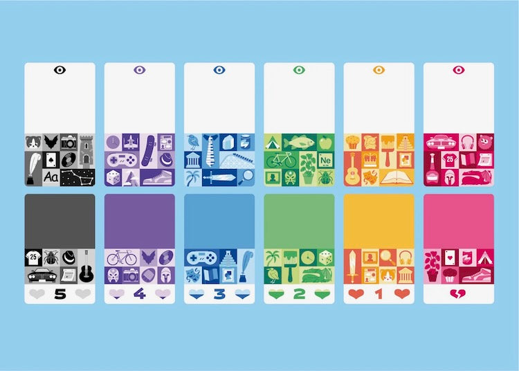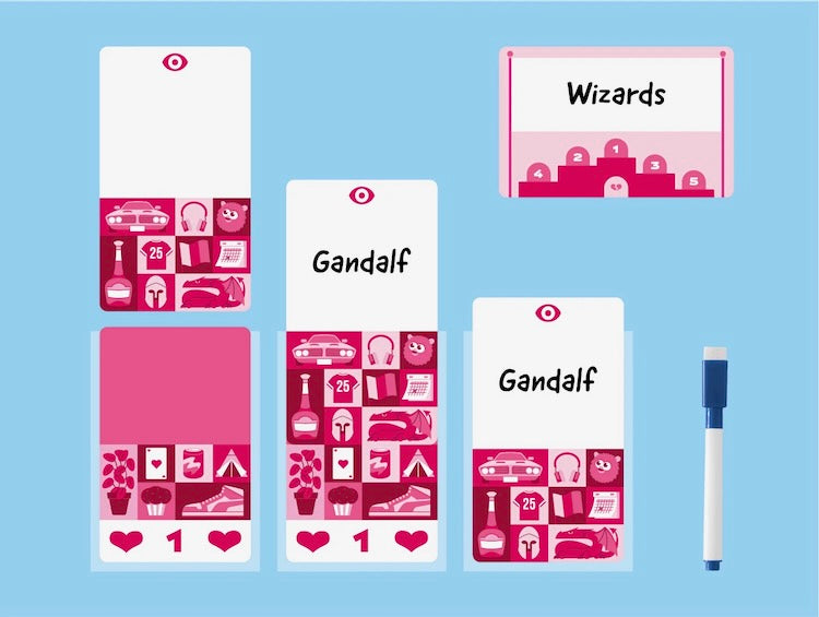 My Favourite Things is an innovative trick taking party game played over two phases. In the first, you’ll compose a list of your top 5 things in a category given to you by another player, and write them down on oversized dry erase cards. In the second, you’ll play tricks using another player's cards, trying to deduce the value of the cards as you go. Play the most favourite thing into each trick to win!