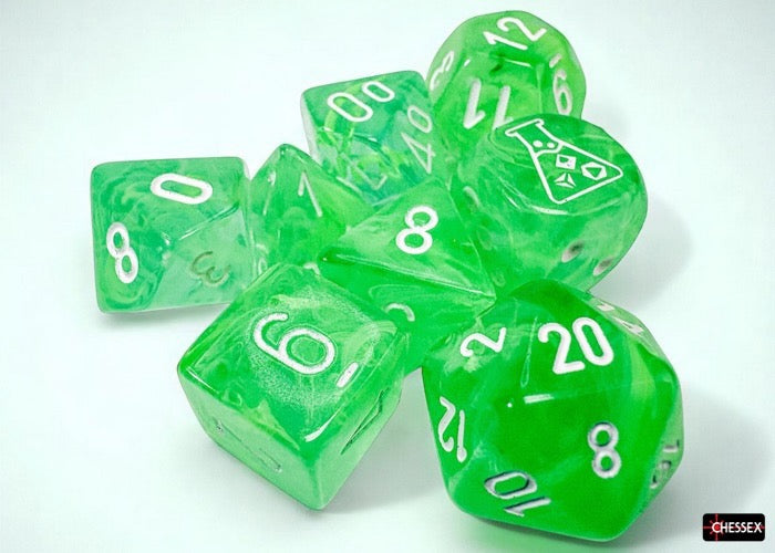 Wave 9 Lab Dice - this polyhedral set comes with a commemorative Lab Dice D6 Pip and come in test tube packaging.