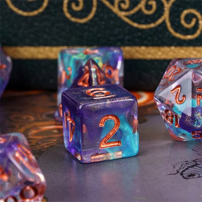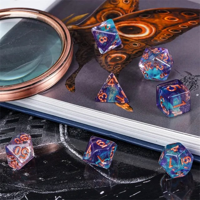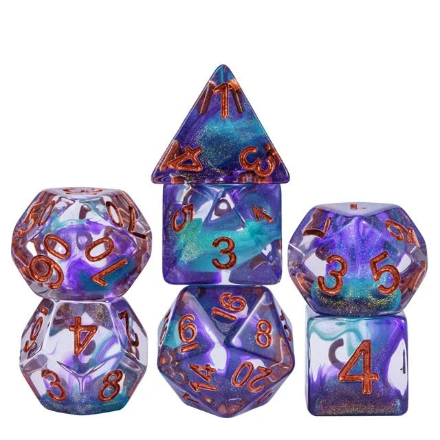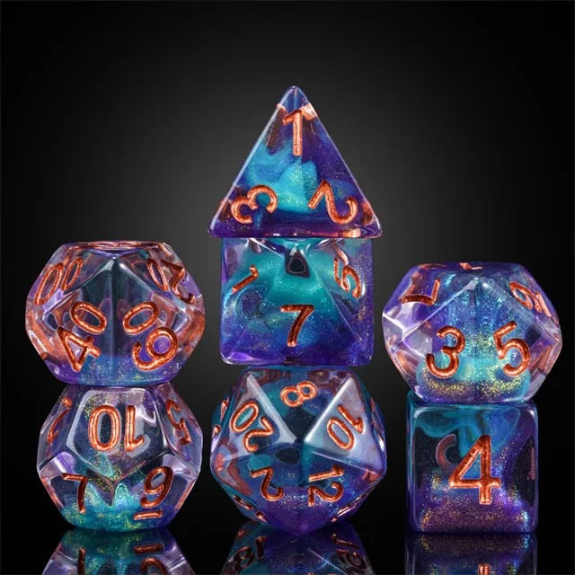 Step into the cosmos with the Nebula's Kiss polyhedral dice set! These stunning dice blend shimmering shades of deep violet and swirling teal, kissed with a touch of glitter to evoke the beauty of a distant galaxy. Featuring bold, fiery orange numbers for easy reading, this 7-piece set includes everything you need for your favorite tabletop RPGs: d4, d6, d8, d10, d%, d12, and d20. Perfect for players who want a touch of the stars in every roll, Nebula's Kiss brings magic, mystery, and cosmic wonder to your gaming table.