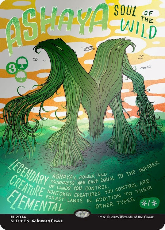 Have you ever misplaced something important? Something really important? We have. For example, our product architect designed an entire Ashaya, Soul of the Wild Commander deck, with amazing art from Jordan Crane, for our plant-loving project manager's birthday. Then someone accidentally deleted the decklist and misplaced 95 of the cards. Those were the only copies. But the boss is gone, and we made an executive decision: we'll just print the cards we have and let people grow their own Ashaya deck from these five seeds. Happy gardening!