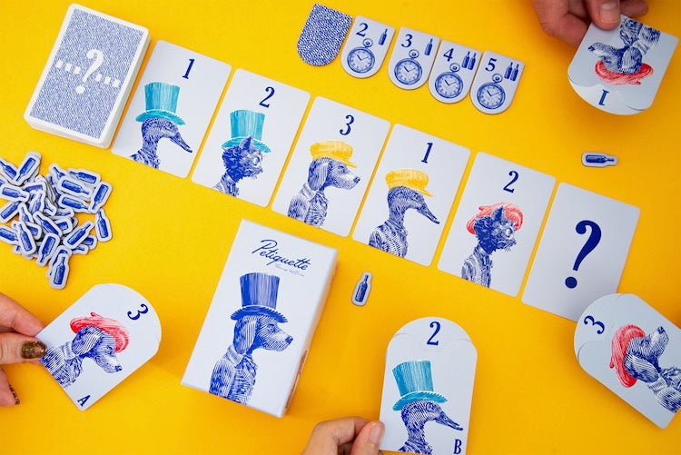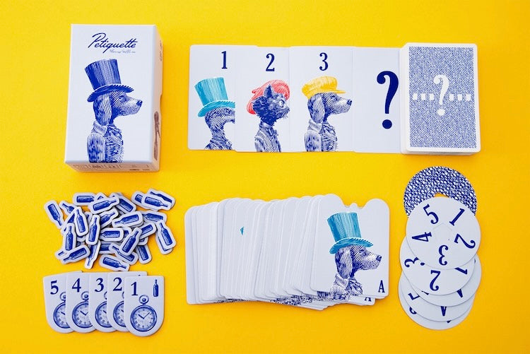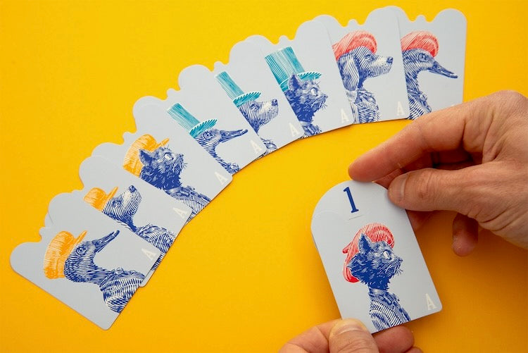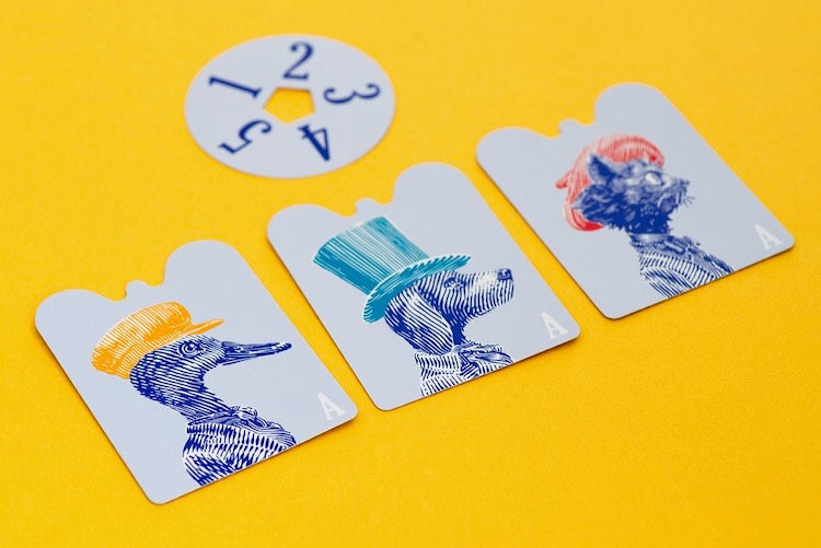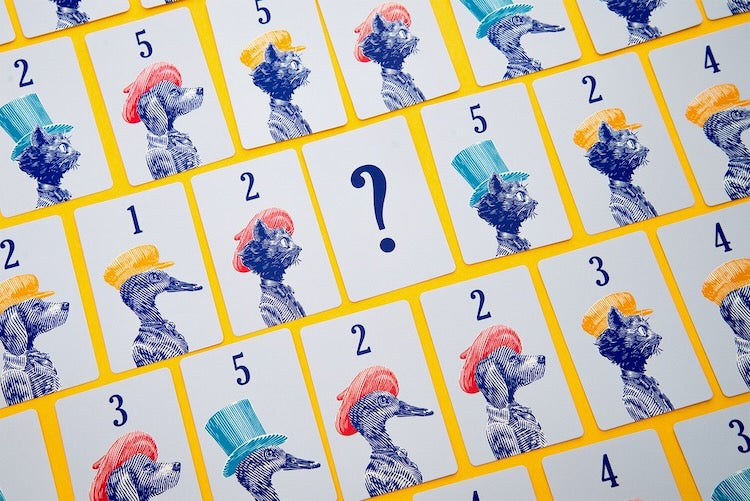 "Petiquette" is a fresh, new kind of game played with cards with combinations of three animals, three hats, and five numbers. Players look at a lineup of five randomly placed cards and try to find some logic or pattern within them. Then they choose which card would most properly fit into that pattern. For example, if the sequence is “red, red, yellow...” you might feel that yellow should come next. If it’s “dog, cat, bird…” then maybe dog again feels right. But there’s no single correct answer. If someone else chooses the same card as you, you'll earn points.