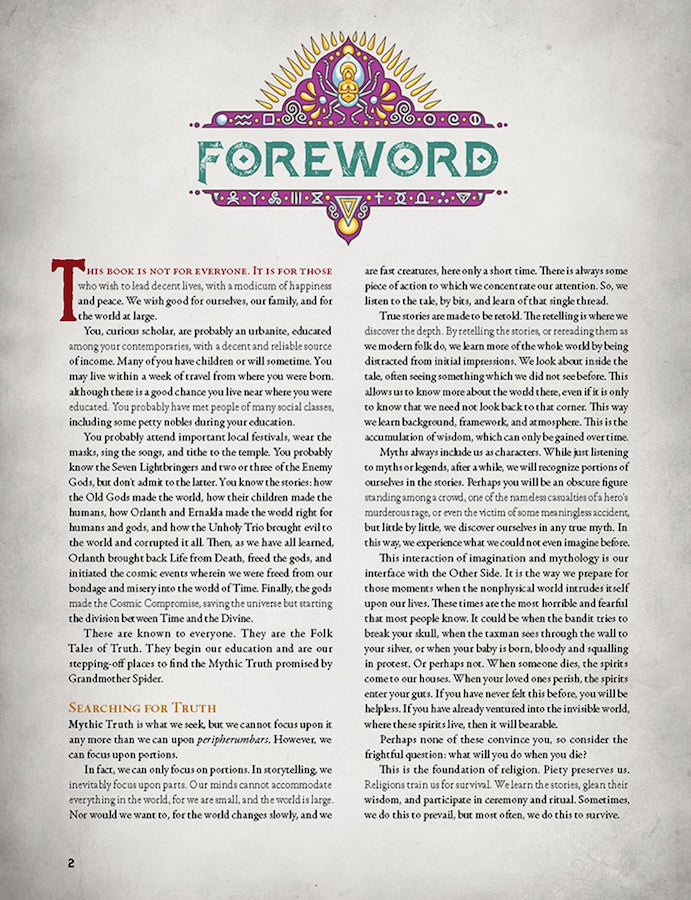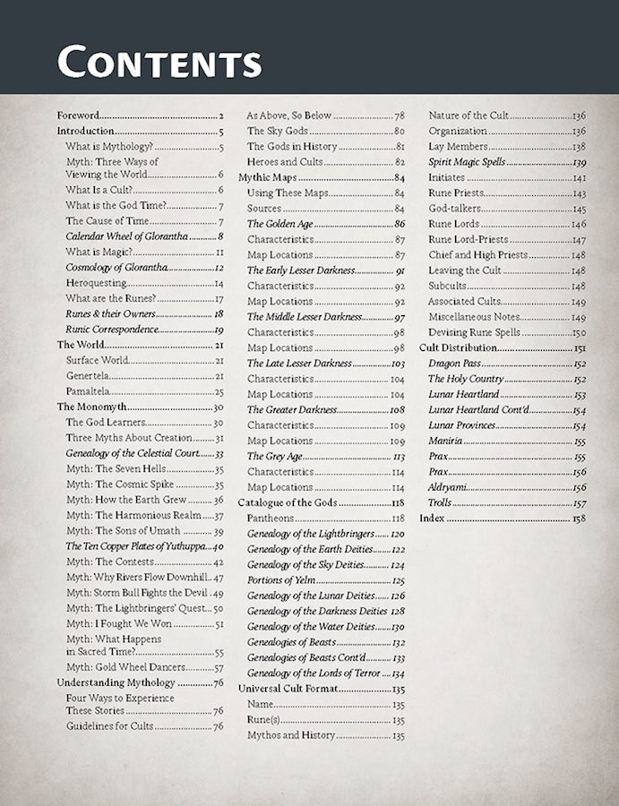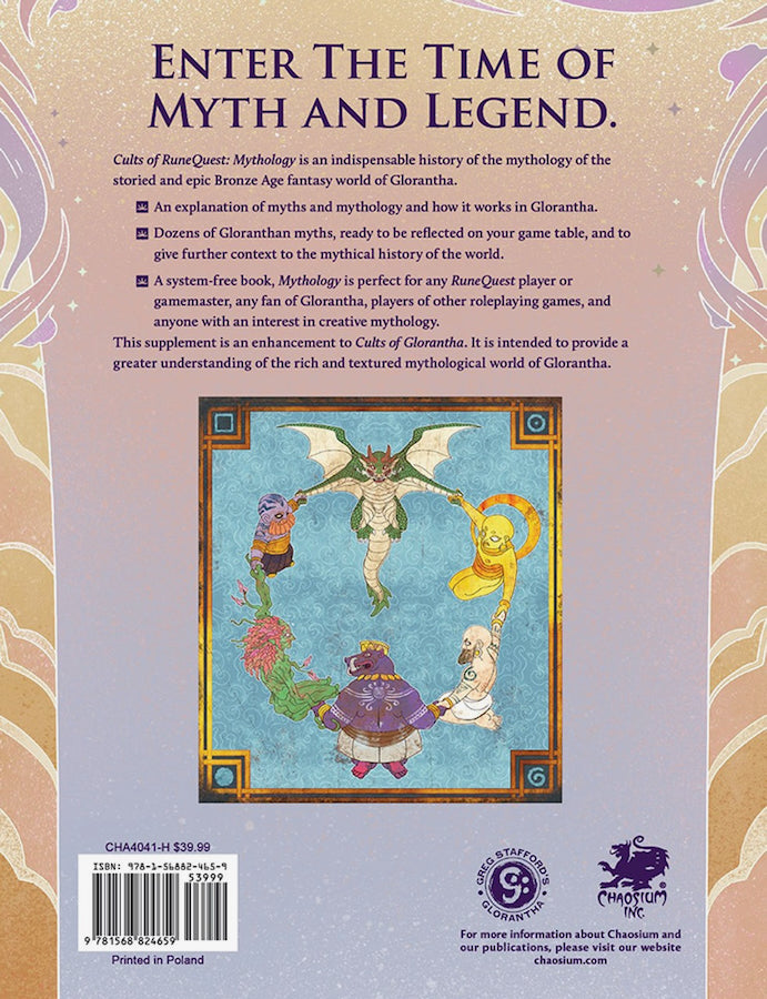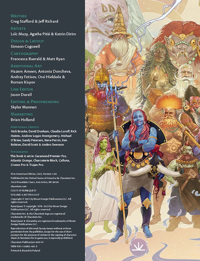 Cults of RuneQuest: Mythology is a system-free book with no rules text. This supplement is perfect for any RuneQuest player or gamemaster, as well as any fan of the world of Glorantha, players of other roleplaying games, and anyone with an interest in creative mythology.