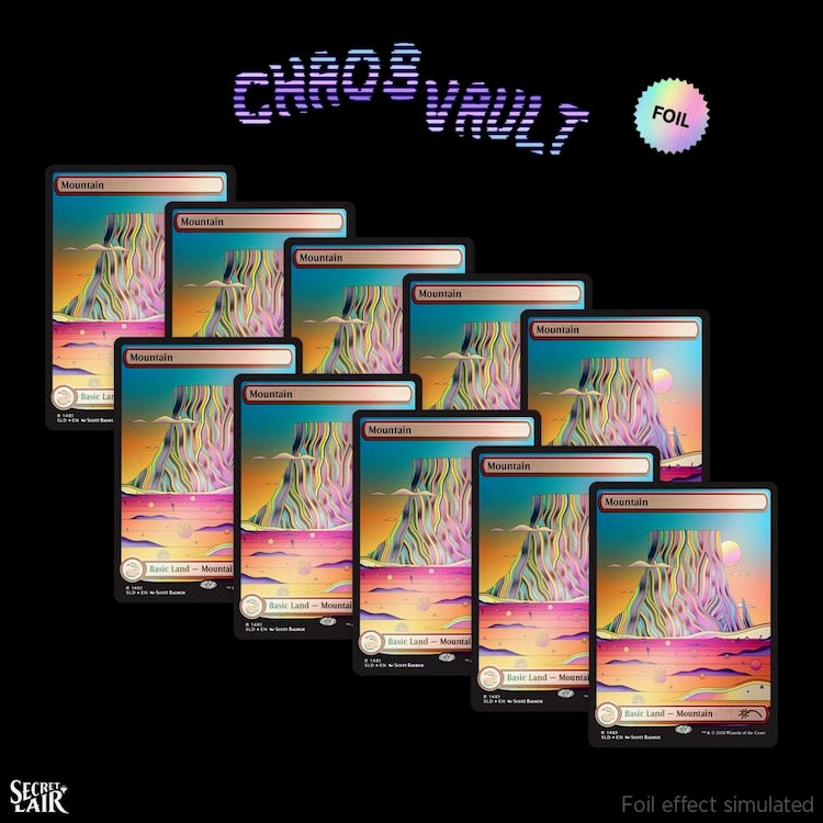 We're going to use the second Chaos Vault release to settle a longstanding debate here at Secret Lair. Nate thinks it's better to sell basic lands split up by type so you can pick one and get multiple copies, whereas Mark likes doing them as a cycle. Their bickering has become an annoyance, so here we are.