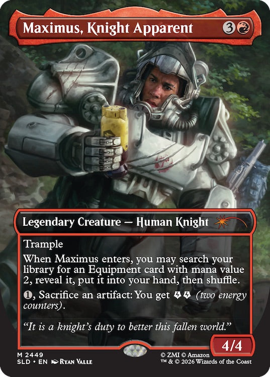 For the first time, the survivors from Prime Video’s Fallout series make their debut with new-to-Magic designs. Lucy MacLean brings her optimism to the battlefield with The Golden Rule, a once-per-turn ability that lets you trade token favors for card draw. The Ghoul feeds on death itself, stacking up Rad counters to mill or wipe out opponents—or, if you’re feeling bold, take that radiation yourself for extra resources. And Maximus, ever the true believer, turns scrap into strength, fuelling up on Energy as he powers up his own T-60 Power Armor.