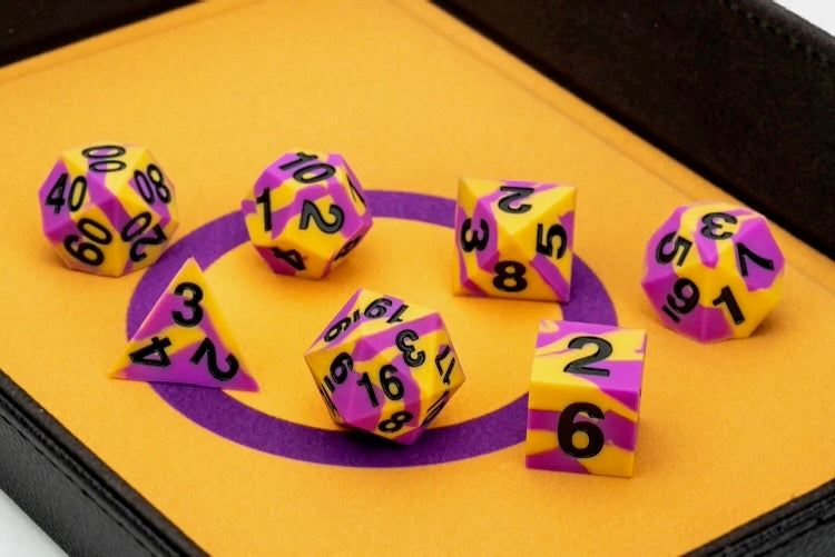 Each full-sized, 16mm set comes with 7 dice (d4, d6, d8, d10, d10% (00-90), d12, and d20). With these dice you’ll be able to play in various TableTop Role Playing Games such as Dungeons and Dragons, Pathfinder, Call of Cthulhu and countless others. Your story is ready to tell at a roll from your fingertips.