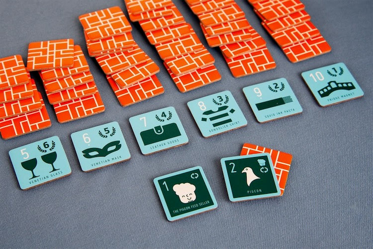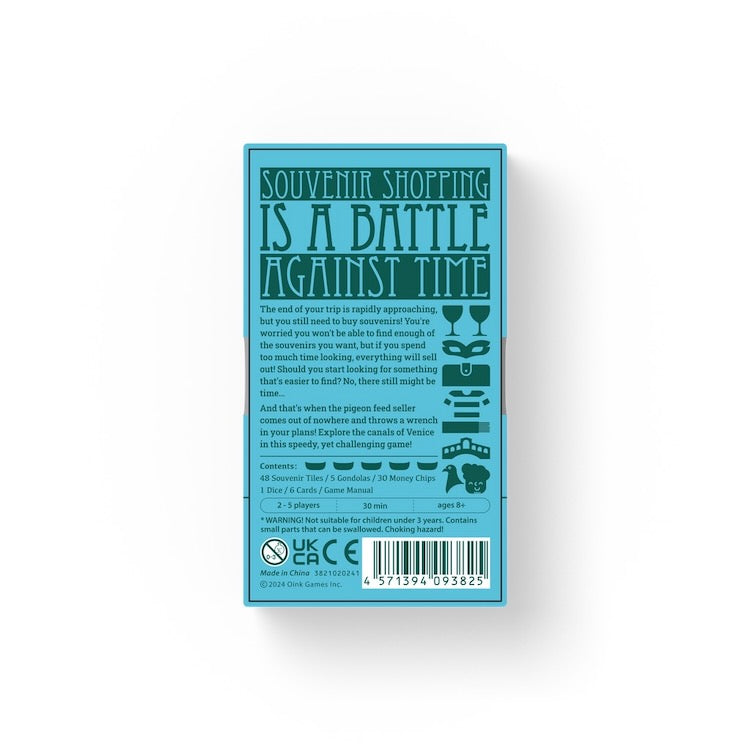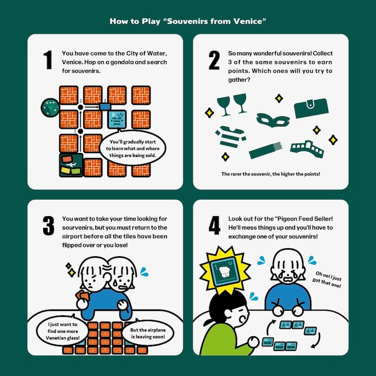 "Souvenirs from Venice" is a board game where you roll dice and move your gondola through the city of Venice looking for souvenirs. From out of the 6 different types, you want to buy and take home the rarest ones, but you need to collect enough for 3 people. However, if you don't make it back to the airport before all of the tiles are flipped over, time's up, and the plane takes off. And that's when the pigeon feed seller comes out of nowhere and throws a wrench in your plans! Featuring rules that are great for a wide range of ages, explore the canals of Venice in this speedy, yet challenging game!