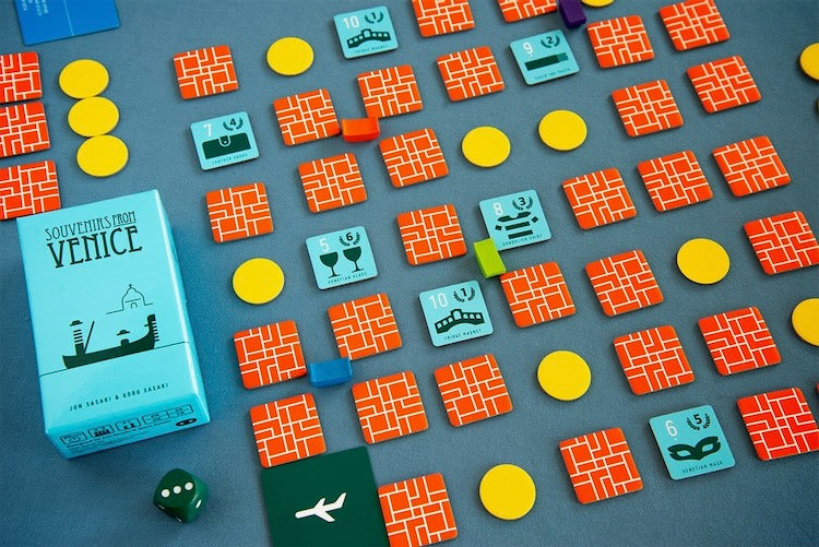By lining up the tiles, you can create the city of Venice. On the back side of the tiles are various charming souvenirs such as "Venetian glass" and "squid ink pasta". It also contains many exciting components like a special dice and gondola-shaped wooded pieces.