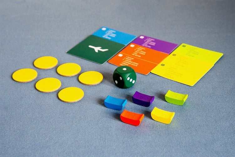 Roll the dice and move your gondola through the tiles spread out on the table. You can buy souvenirs from the nearby tiles. The tiles will be easier to collect as they gradually turn face up, but you need to return to the airport before everything gets flipped over!