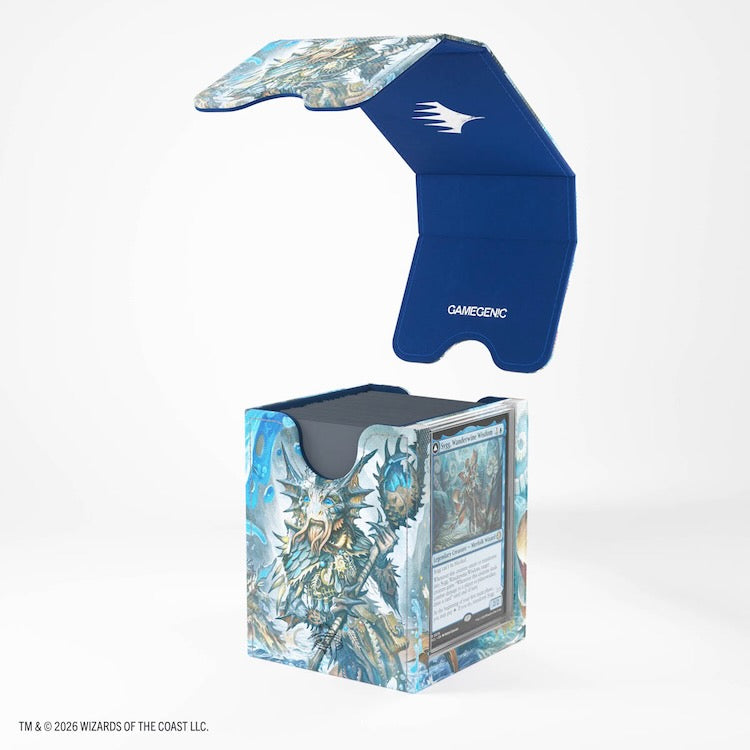 It offers a clear innovation: display your Top Card or Commander without opening the box. The included Slide Card Case keeps your card UV-protected, easily visible for deck recognition, and can be detached for use during gameplay — keeping your card protected at all times. The box holds 100 double-sleeved cards, even with extra thick inner sleeves, or 100 regular double-sleeved cards with additional space for token cards. Equipped with our highly rated Convertible System, the removable cover clips onto the bottom of the box, saving table space and allowing easy card access during play.