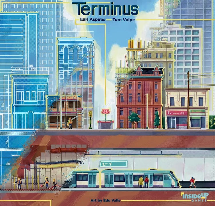 Terminus is a subway planning, developing, and construction game for 2-5 players, and takes roughly 30-40 minutes per player.