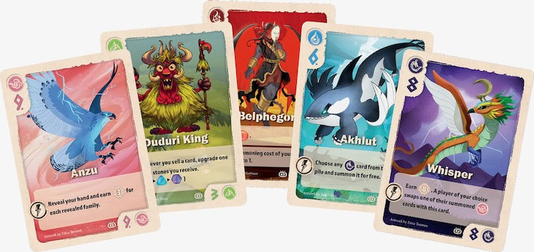 In more detail, at the start of a round reveal twice as many creatures as players in the usual way, then starting with the first player, each player drafts an artifact without their marker on it by placing their marker on that artifact. (In effect, you can't draft the same artifact you had the previous round.) Some artifacts have instant effects you use immediately, others give you a permanent effect that entire round, and others grant you an action that you can use once on a turn. After drafting artifacts, players draft creature cards in the usual way.