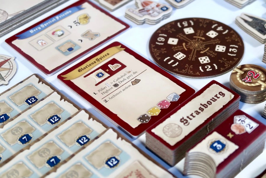 Tiletum is a dice management game in which dice have a dual function: gaining resources and performing actions. A certain number of dice will be rolled each round. On your turn, choose a die to gain the number of corresponding resources equal to the value of the die, then perform the associated action. The power of the action is inversely proportional to the value of the die, so the fewer resources you gain, the more powerful the actions you take and vice versa.