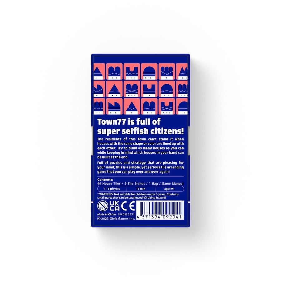 "Town 77" is an updated version of "Town 66" released by Oink Games in 2022. Originally for 1-4 players, it has now been upgraded to be playable with up to 5 players. We hope you enjoy "Town 77" which has been enhanced with a new color and shape!