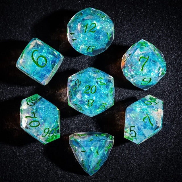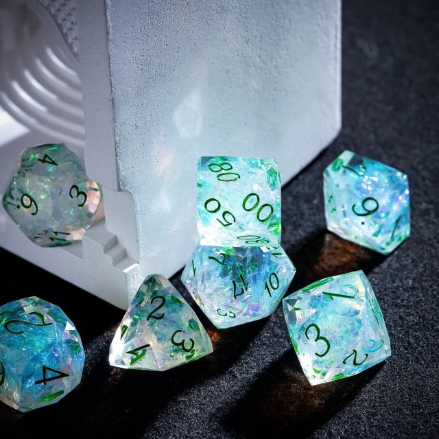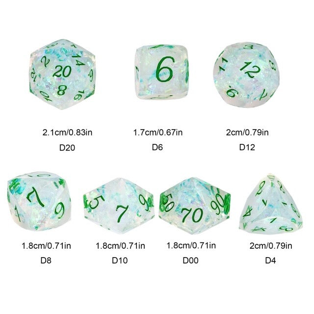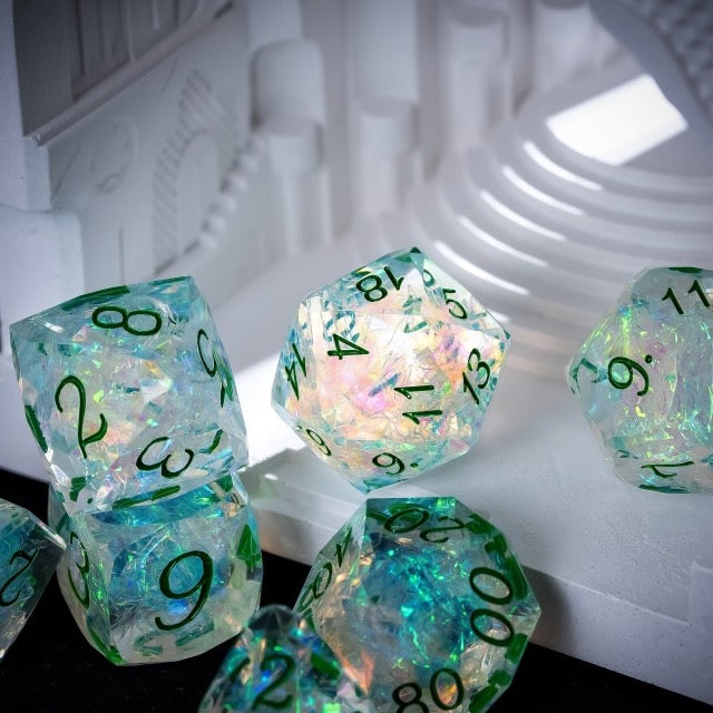 These crystal clear dice shimmer with opalescent flakes that catch the light like dewdrops in the morning sun and feature vibrant green numbers which cast a green hue through the dice.
