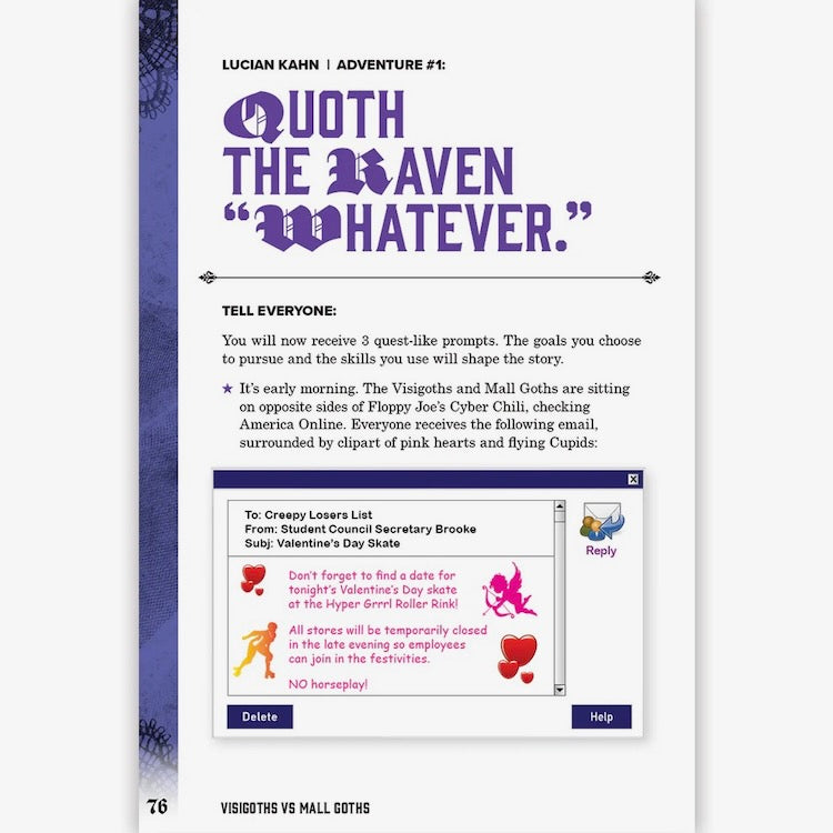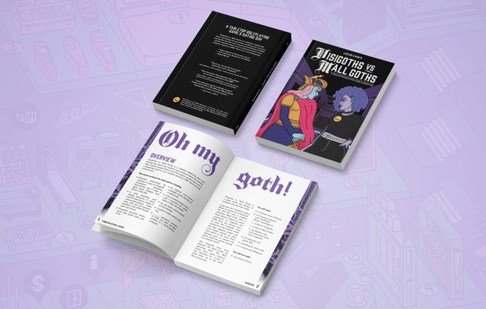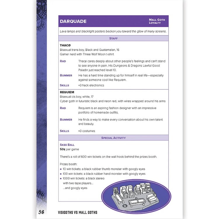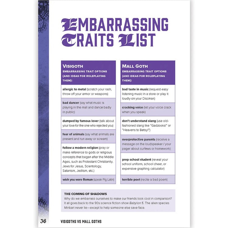 Lucian Kahn's Visigoths vs. Mall Goths is a tabletop roleplaying game and dating sim about the conflicts and romances among the warriors who sacked ancient Rome and 20th century spooky teens, set in a suburban Los Angeles shopping mall during 1996. There are a lot of bisexuals.